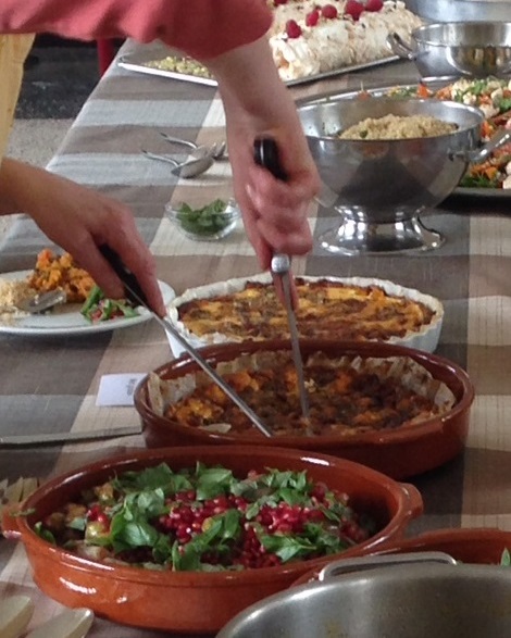 Op de eerste dag viel direct op dat het stafteam bijzonder veel aandacht besteedde aan het visuele aspect. Zij dienden de maaltijden midden op een grote tafel op als een aantrekkelijk arrangement van kleurige en geurige schotels. “Mooi maar onhandig,” dacht ik bij het opscheppen, “ik moet twee, drie keer rond de tafel lopen omdat de borden aan niet aan de deurzijde staan en de volgorde van de gerechten niet logisch is. Het toetje staat naast de borden en de rijst staat aan de andere kant.
